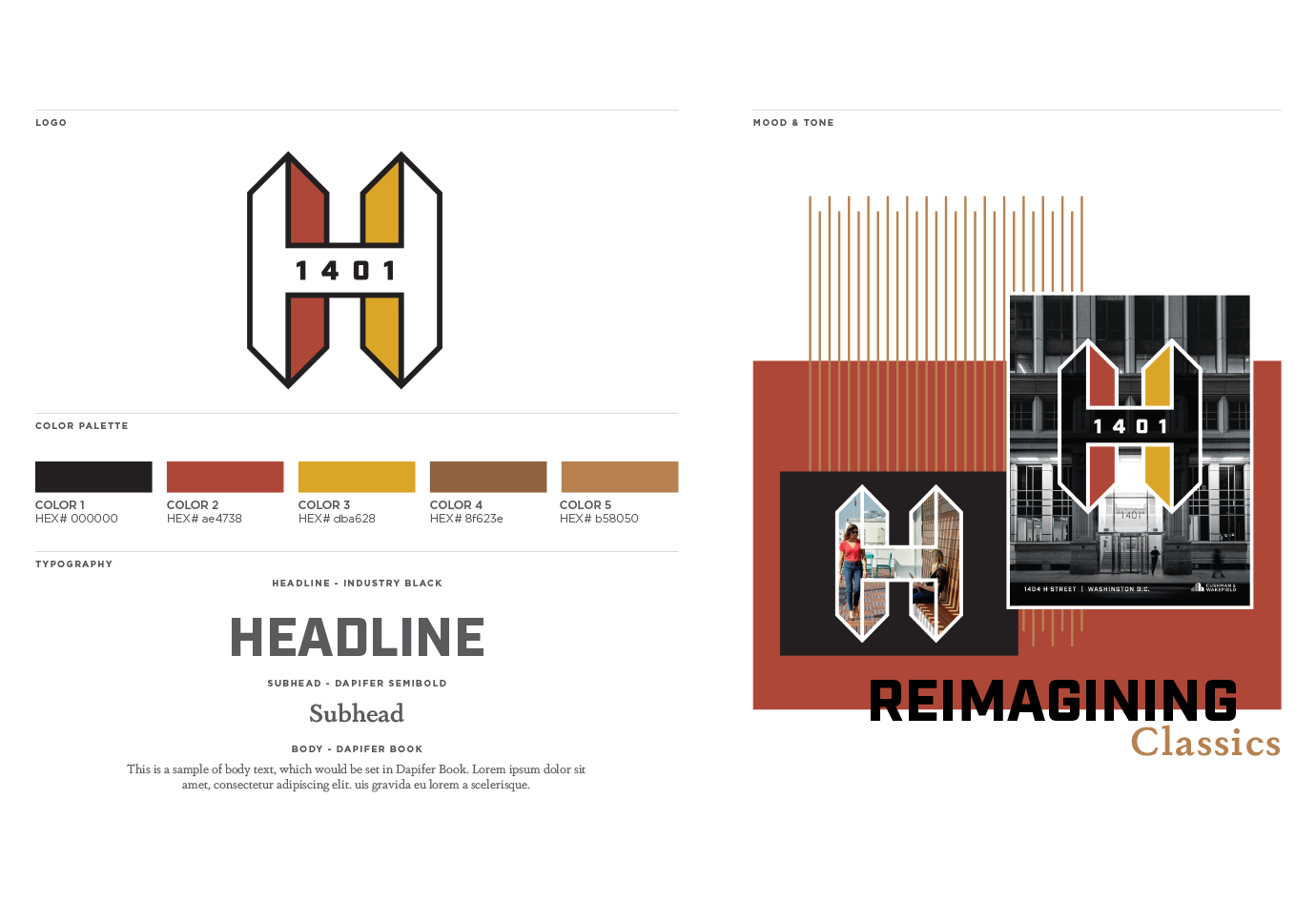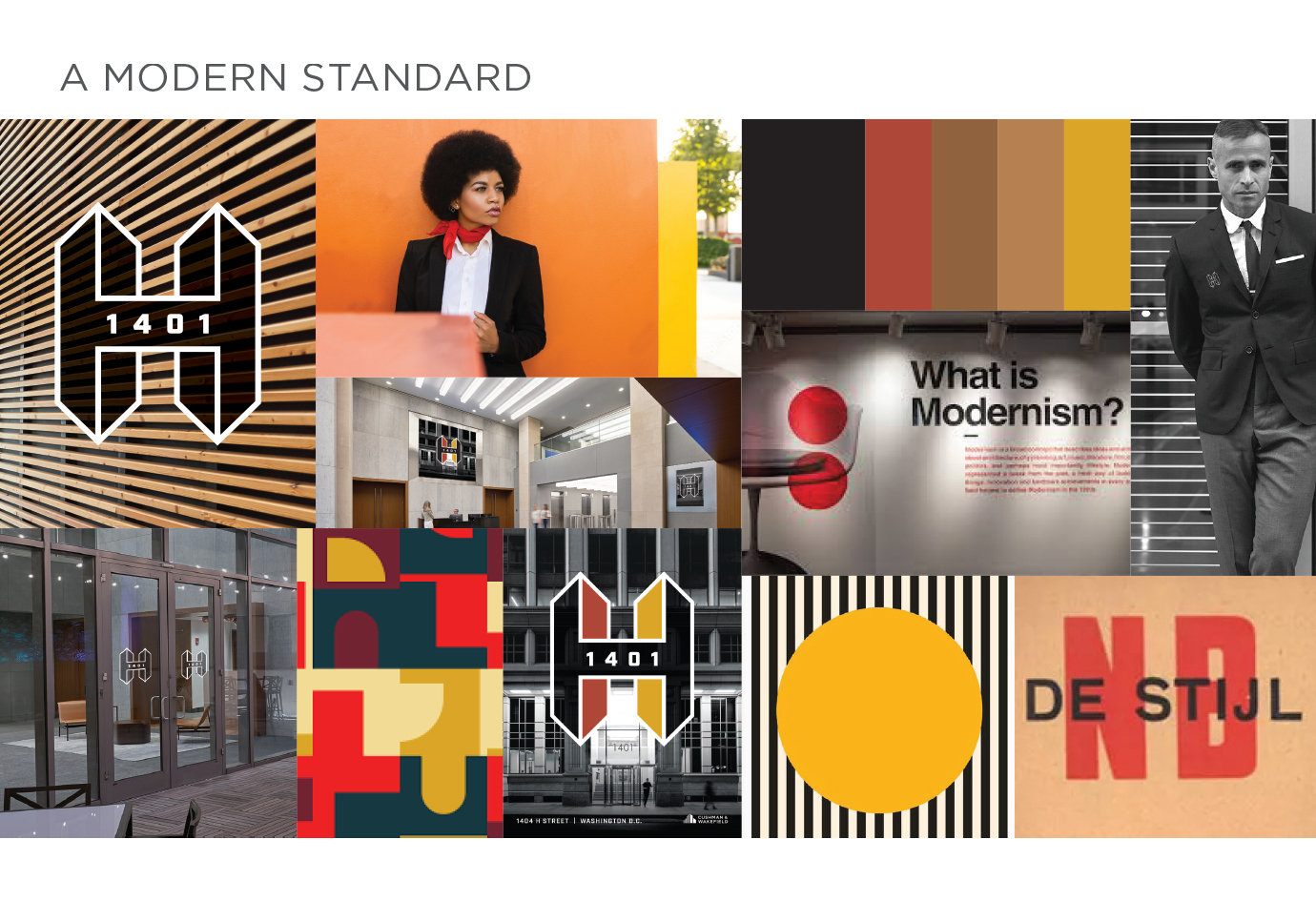Mood board and initial logo concept for the rebrand of 1401 H in Washington, D.C.